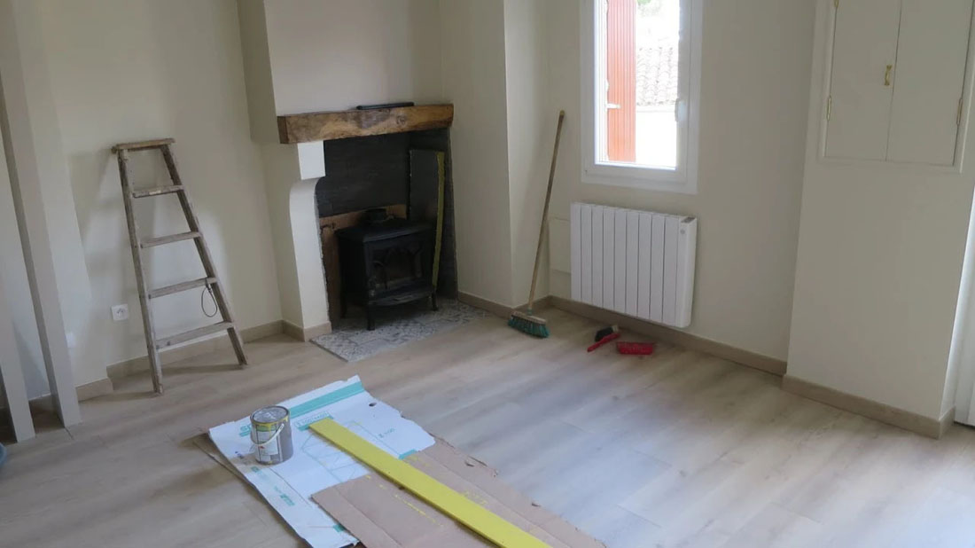 Samedi 13 février, le tout dernier travail intérieur : découpe et peinture du parement de la douche de la salle de bain.